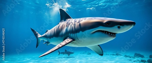 Fototapeta premium Apex predator great white shark underwater hunting, predator, marine ecosystem