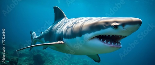 Fototapeta premium Apex predator great white shark underwater hunting, predator, swimming
