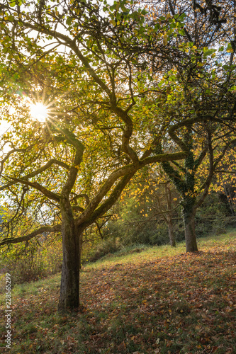 Fototapeta premium Apfelbaum auf Wiese mit Sonne im Gegenlicht