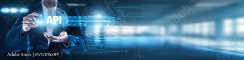 Fototapeta premium API, developer holding connected global industry, software integration, data exchange, interoperability, microservices, third-party access, digital platforms, and scalable cloud-based applications.