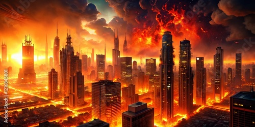 © Man888, Fototapeta premium Apocalyptic Cityscape: Burning Metropolis at Night - Dramatic Stock Photo