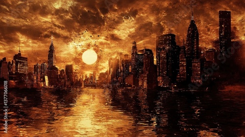 © slamet, Obraz premium Apocalyptic Cityscape: Fiery Sunset over Submerged Metropolis