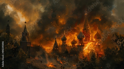 Fototapeta premium Apocalyptic conflict moscow s red square skyline engulfed in war smoke,...