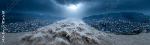 © Chainat, Fototapeta premium Apocalyptic Flood: A powerful and dramatic image capturing the awe-inspiring force of nature, as a torrential flood inundates a city. A visual of water level rising and destructive devastation.