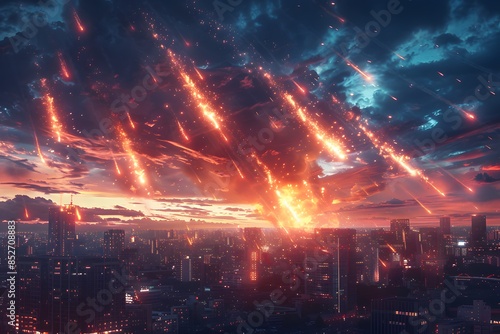 © D, Fototapeta premium Apocalyptic Scene of Meteor Shower Impacting a Modern City at Dusk Dramatic and Fiery Skyscape