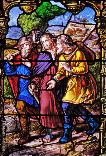 © zatletic, Fototapeta premium Appearance to the two disciples on their way to Emmaus , stained glass windows in the Saint Gervais and Saint Protais Church, Paris, France