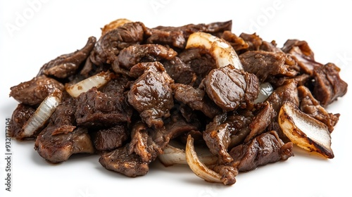 © Serhii, Obraz premium Appetizing pieces of fried meat with onions on a white background, isolated