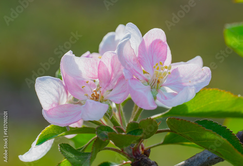 Fototapeta premium Apple blossoms of the red delicious cultivar softly lit by morning sunlight to show their delicate structure and hues of pink