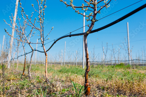 © davit85, Obraz premium Apple orchard garden in springtime with rows of trees with blossom.