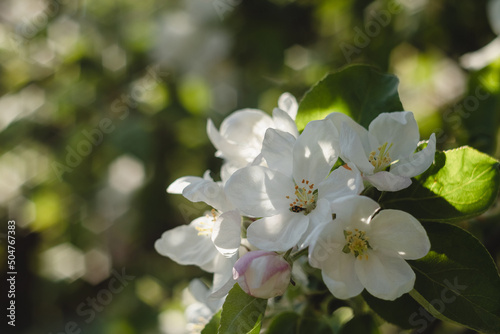 Fototapeta premium Apple tree blossom on a green blurred background in a spring garden. White apple flowers close up.