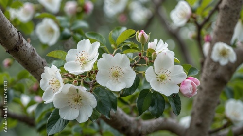© GenZGraphics, Fototapeta premium Apple tree blossoms on branch with white flowers and pink buds in soft-focus garden background Copy Space