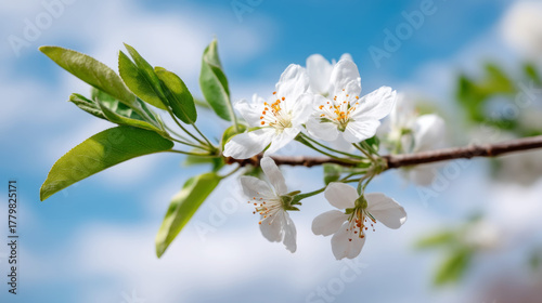 © Sergey, Obraz premium Apple tree branches in full bloom with white blossoms and light green leaves against blue sky