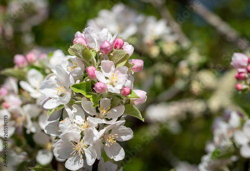 Obraz premium Apple tree flower blossoming at spring time, floral sunny vintage natural...