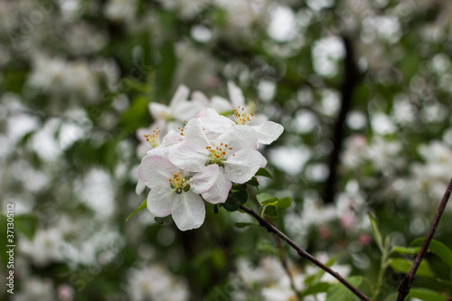Obraz premium Apple tree flowers. Blossom in the rain with drops on petals