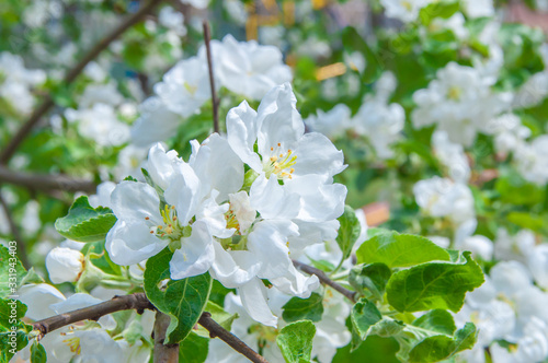 © olga bezhskaia, Fototapeta premium Apple tree flowers white on a green background