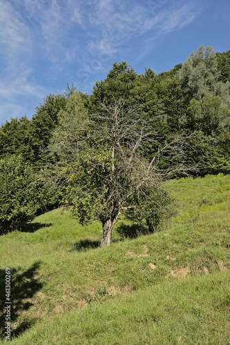 Obraz premium Apple tree on a mountain slope in the Romanian countryside