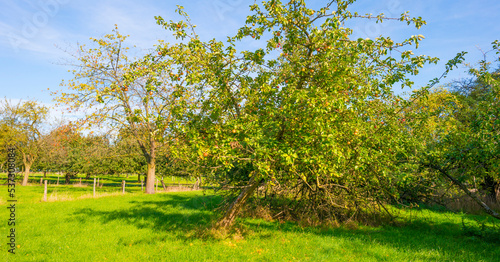 Fototapeta premium Apple trees in an orchard in a green grassy meadow in bright sunlight in autumn, Voeren, Limburg, Belgium, Voeren, Limburg, Belgium, October, 2022