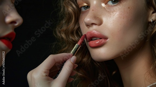 Obraz premium Applying red Lipstick on a beautiful female Model with Beautiful Hair AI...