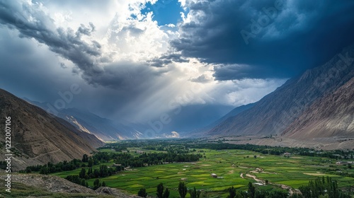© sirisakboakaew, Naklejka premium Approaching storm clouds casting dramatic shadows over a green valley