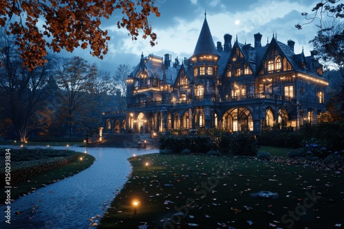 © Nakorn, Naklejka premium Approaching the enigmatic mansion twilight encounter photography eerie shadows captivating scene
