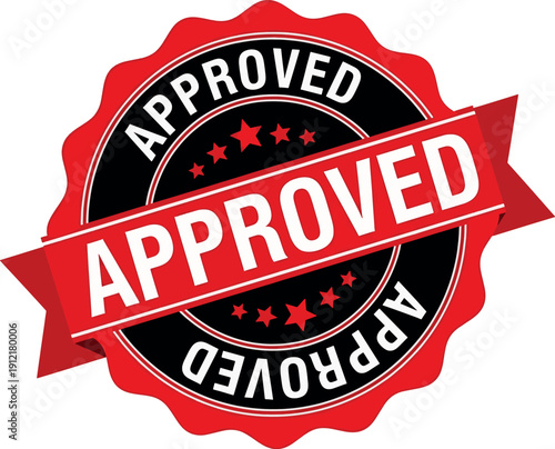 © JOBAER GRAPHIC, Obraz premium Approved Badge Vector Icon – Red Ribbon on Black Seal with Stars