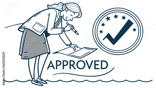 Obraz premium Approved stamp with woman signing document for validation confirmation and official approval illustration