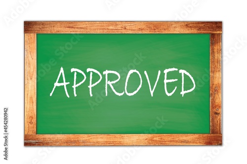 Obraz premium APPROVED text written on green school board.