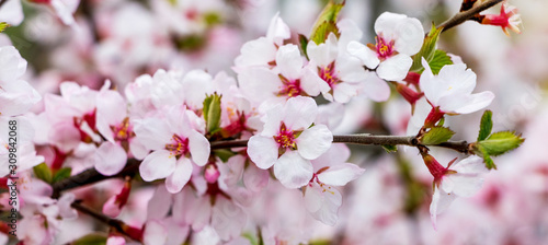 © Volodymyr, Obraz premium Apricot branch with pink flowers in spring garden_