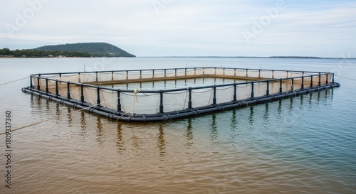 Fototapeta premium Aquaculture fish farm netting in calm lake with hills in background