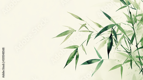 © AngrySun, Fototapeta premium Aquarel ink painting of flying bamboo leaves, minimalist, oriental brushwork, light background. Generative AI