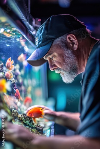 Obraz premium Aquarium enthusiast inspecting vibrant fish tank with colorful fish, underwater scene, hobbyist caring for aquatic life, marine aquarium setup, relaxation.