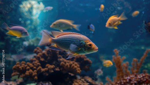 Fototapeta premium Aquarium fish swimming in clear water, reflecting tranquility and focus