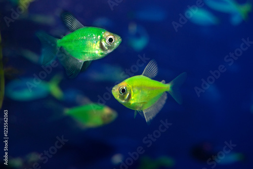 © galliina, Fototapeta premium Aquarium fish-ternetzi swim. Two fish are green. The Latin name Gymnocorymbus ternetzi. Close-up, blue background.