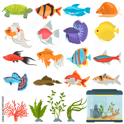 © LynxVector, Naklejka premium Aquarium flora and fauna color flat icons set