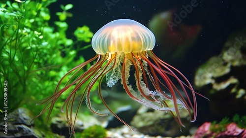 Fototapeta premium Aquarium jellyfish, red tentacles, plants, dark background, marine life