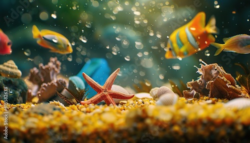 Fototapeta premium Aquarium Month Concept Abstract Colorful Fish Swim Yellow Sand Shells Starfish Crabs