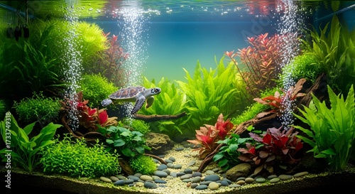 © NEUVANJOSE, Obraz premium Aquatic Ecosystem with Turtle Underwater Plants Bubbles