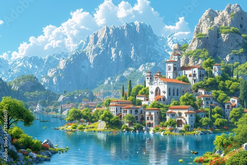 © SAchin love SAtyam, Fototapeta premium Aquatic Paradise: A Serene Mountain Town by the Lake Generative AI