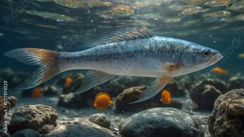 Fototapeta premium Aquatic plants and soft light emphasize the grace of the fish.
