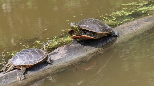 Fototapeta premium Aquatic turtles perched on a submerged log surrounded by lush green moss in a...