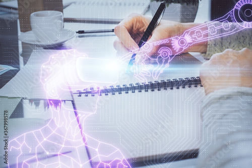 Fototapeta premium AR hologram over hands taking notes background. Concept of augmented reality. Double exposure