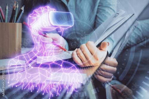 Fototapeta premium AR hologram over hands taking notes background. Concept of augmented reality. Double exposure