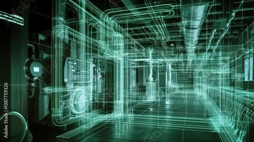Obraz premium AR overlay projected onto floor plan of building showing cable and piping layout
