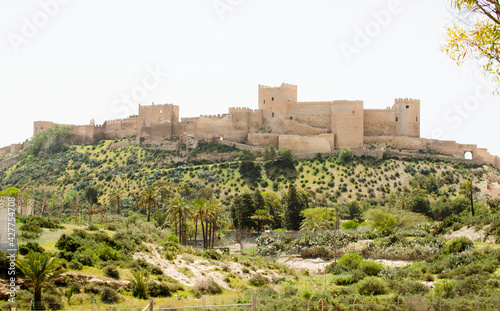 Fototapeta premium Arab fortress with wall and towers on top of a hill surrounded by lush...