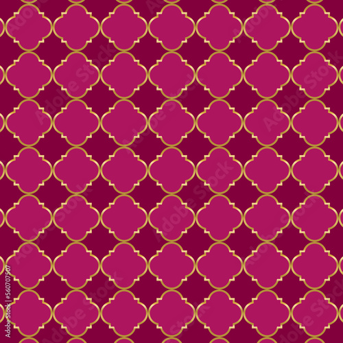 © Tanita, Naklejka premium Arabesques background of geometric islamic trellis pattern in red with gold outline. Moroccan pink quatrefoil arabesques pattern