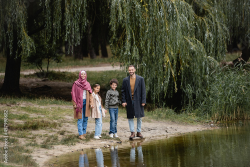 Fototapeta premium Arabian family smiling at camera near lake in park