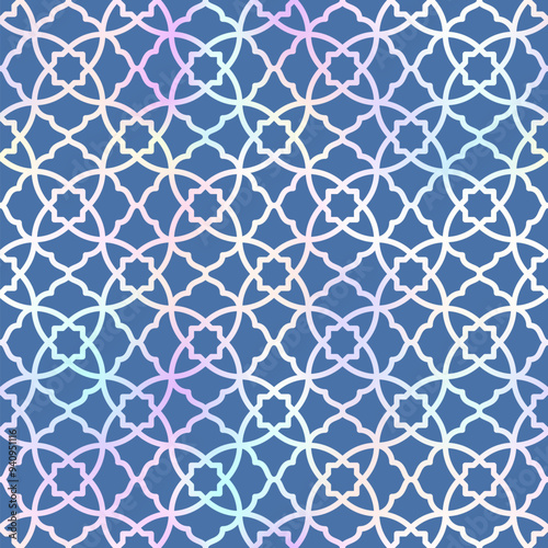 © Ketmut, Fototapeta premium Arabic style gradient seamless pattern. Vector holographic oriental ornament on blue background. Oriental traditional texture for backgrounds, wallpapers, textile patterns, decoration