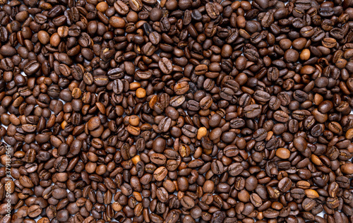 Fototapeta premium Arabika coffee beans background. Top view of Roasted Beans. food and drink...