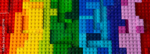 © antoniofrancois, Obraz premium Arad,Romania - February 2, 2025: Multicolored rainbow colorful gradient background Lego Classic structure pieces. Modern bright backdrop design