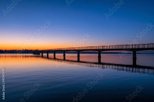 © haiqiang, Fototapeta premium arafed bridge over a body of water with a sunset in the background